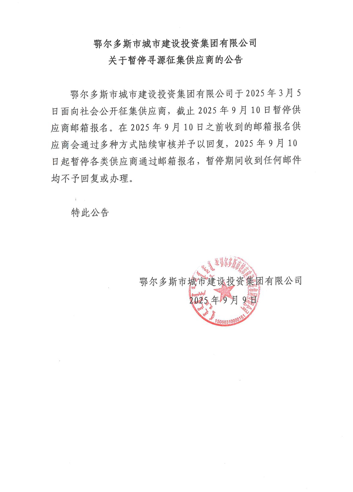 鄂爾多斯市城市建設(shè)投資集團(tuán)有限公司關(guān)于暫停尋源征集供應(yīng)商的公告