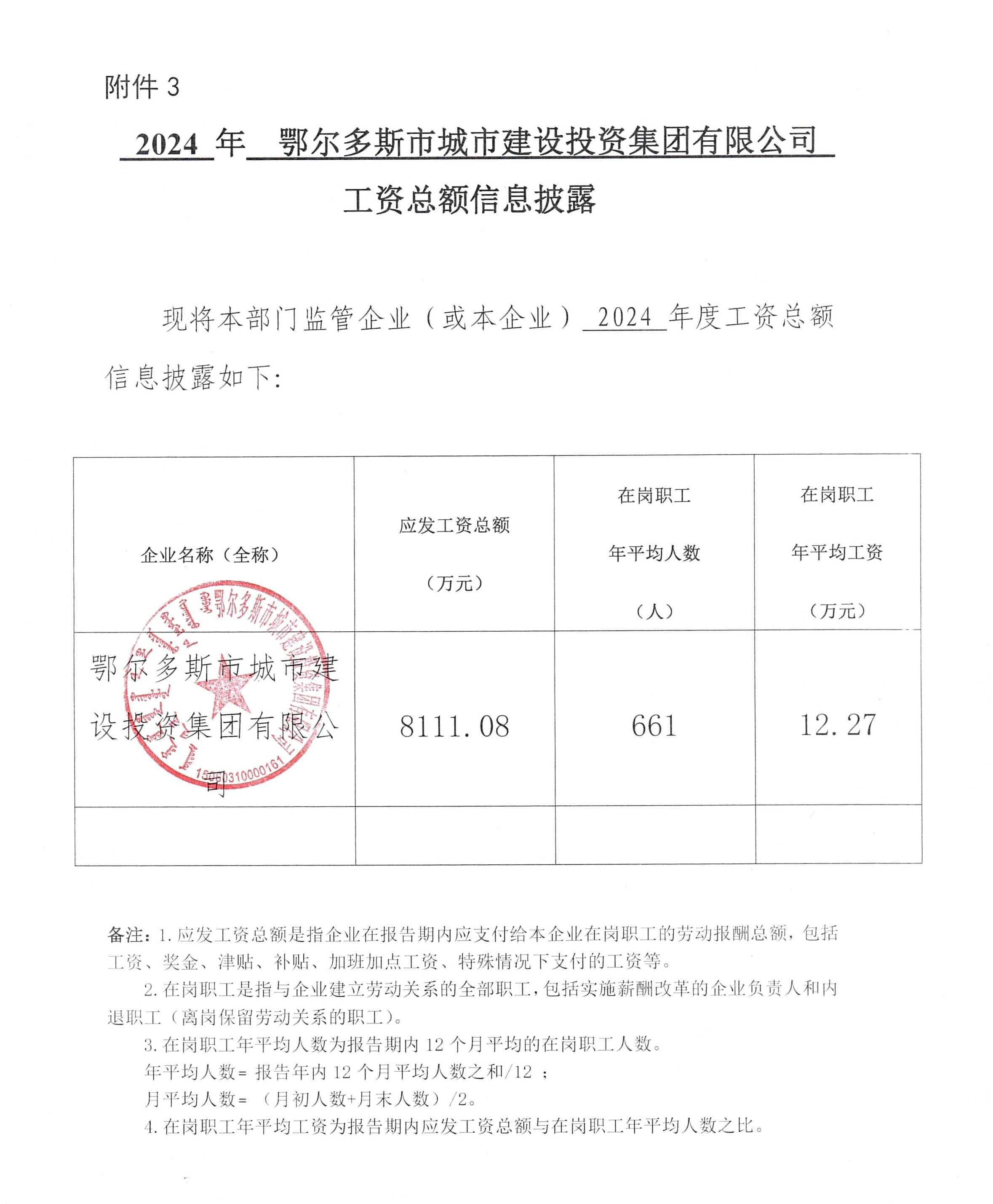 2024年鄂爾多斯市城市建設投資集團有限公司工資總額信息披露