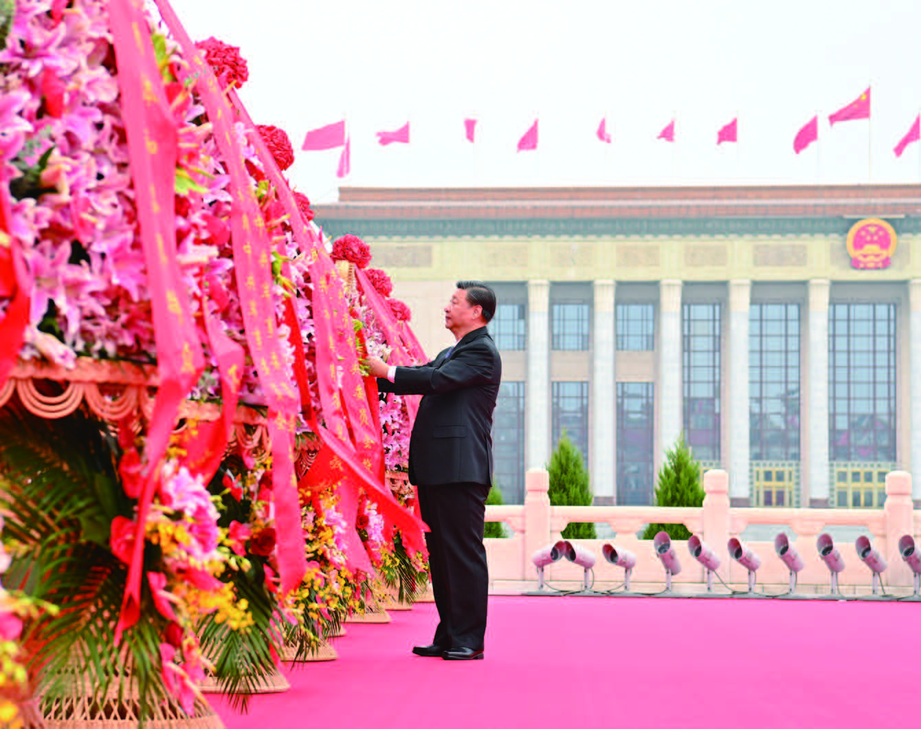 9月30日上午,黨和國(guó)家領(lǐng)導(dǎo)人習(xí)近平、李克強(qiáng)、栗戰(zhàn)書、汪洋、王滬寧、趙樂際、韓正、王岐山等來(lái)到北京天安門廣場(chǎng),出席烈士紀(jì)念日向人民英雄敬獻(xiàn)花籃儀式。這是習(xí)近平整理花籃上的緞帶。