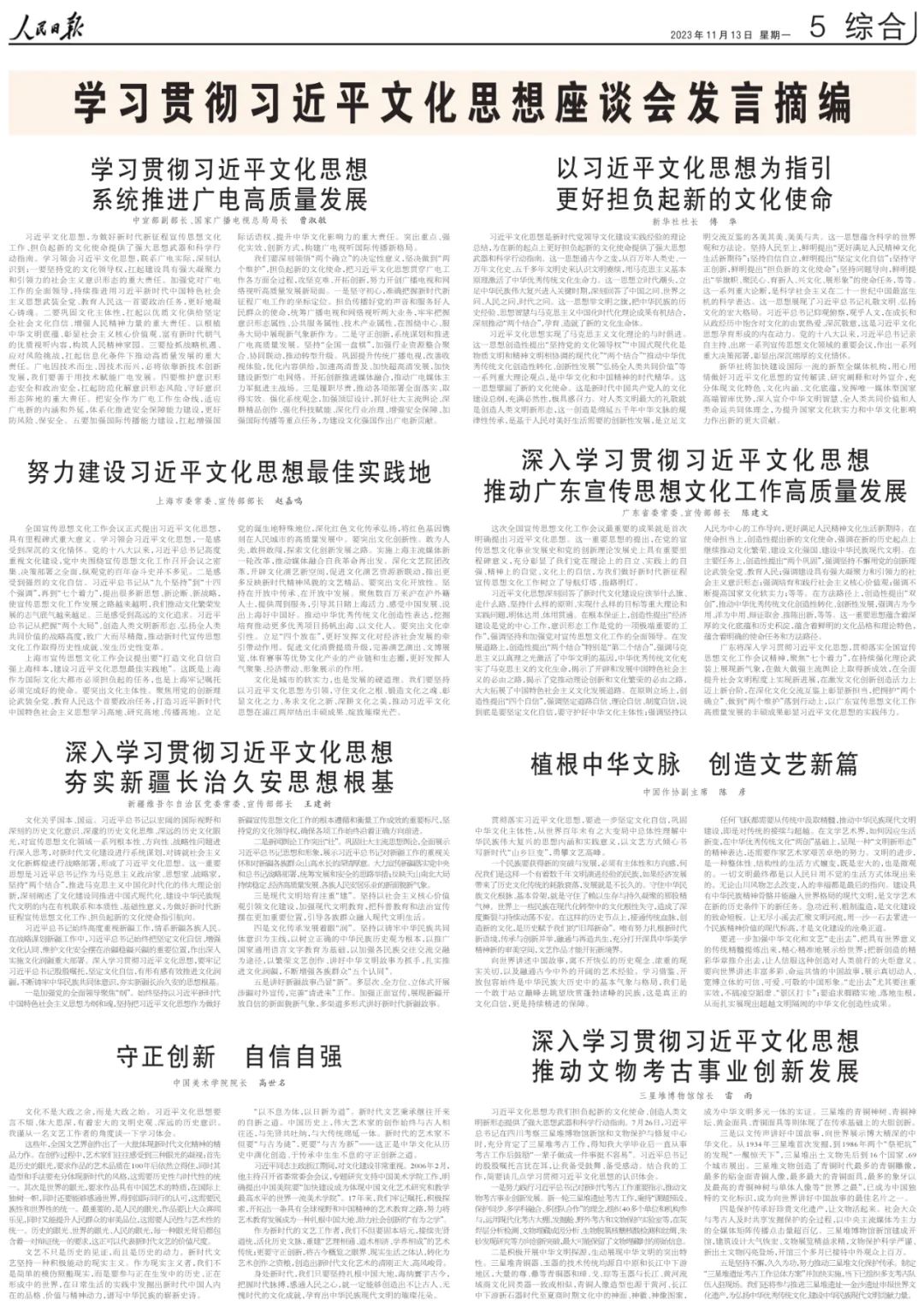 學(xué)習(xí)貫徹習(xí)近平文化思想座談會(huì)11月6日在京召開。11月13日,《人民日?qǐng)?bào)》刊載了座談會(huì)發(fā)言摘編。以下分別是中宣部副部長(zhǎng)、國(guó)家廣播電視總局局長(zhǎng)曹淑敏,新華社社長(zhǎng)傅華,上海市委常委、宣傳部部長(zhǎng)趙嘉鳴,廣東省委常委、宣傳部部長(zhǎng)陳建文,新疆維吾爾自治區(qū)黨委常委、宣傳部部長(zhǎng)王建新,中國(guó)作協(xié)副主席陳彥,中國(guó)美術(shù)學(xué)院院長(zhǎng)高世名,三星堆博物館館長(zhǎng)雷雨所作的發(fā)言。